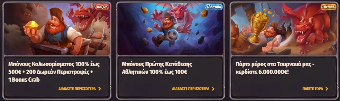 - Μπόνους καλωσορίσματος καζίνο: 100% έως 500 € + 200 δωρεάν περιστροφές + 1 Bonus Crab