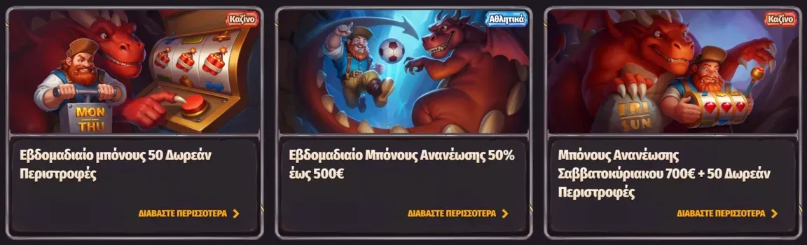 Το Dragonia Casino προσφέρει ένα ολοκληρωμένο πρόγραμμα ανταμοιβών που μετατρέπει κάθε στιγμή παιχνιδιού σε ευκαιρία για επιπλέον κέρδη. Από το μπόνους καλωσορίσματος μέχρι τις εβδομαδιαίες προσφορές και το VIP πρόγραμμα, οι παίκτες απολαμβάνουν συνεχείς ανταμοιβές.